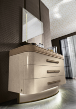 *Кровать с обитым каркасом 180x200 233x217x160 *Кровать с обитым каркасом 200x200 243x217x160 *Кровать с обитым каркасом и оснащённой панелью 180x200 408 x217x160 *Кровать с обитым каркасом и оснащённой панелью 200x200 АЛМАЗНАЯ ЖИЗНЬ РОСКОШНАЯ ЖИЗНЬ Коллекцией Diamond компания Mobilpiù подтверждает свою способность полностью обставить жилые и обеденные зоны дома, элегантно и престижно. Концепция, философия дизайна в непрерывном развитии, которая представляет собой широкий горизонт конфигураций, которые вместе создают аутентичную, гостеприимную и очаровательную атмосферу. 408 x217x160 *Прикроватная тумбочка с подсветкой LED, стеклянная столешница с эффектом мрамора 66x44x58 *Комод с подсветкой LED, стеклянная столешница с эффектом мрамора 137x55x90 *Комод с подсветкой LED, стеклянная столешница с эффектом мрамора 180x56x88 *Зеркало для комода с подсветкой LED 98x16x102 *Туалетный столик, стеклянная столешница с эффектом мрамора 145x50x78 *Зеркало для туалетного столика с подсветкой LED 134x16x89 *Кресло для туалетного столика из ткани 70*55*65 *Шкаф 4-х створчатый L.282xP.64xH.255