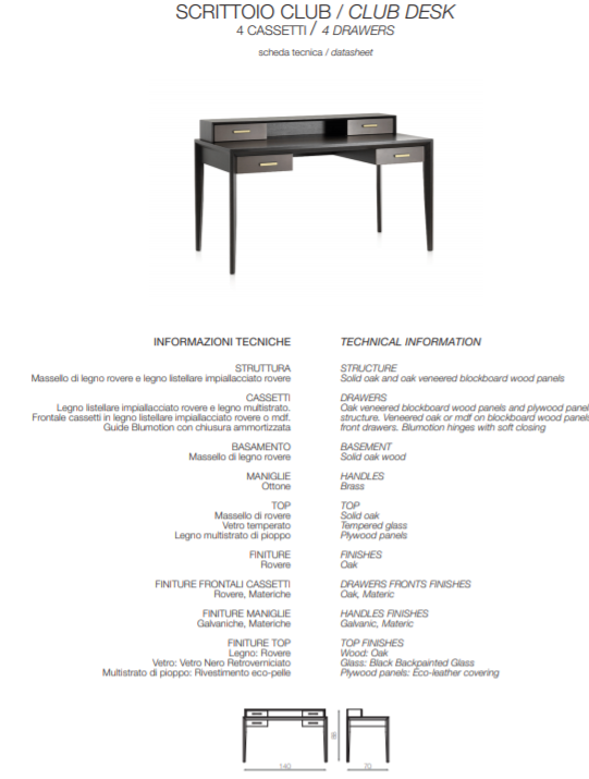 Club 2 drawers desk The Club 2 drawers desk is a statement-making piece made of oak wood. This item features two capacious drawers with a neat expression./Club 4 drawers desk The Club 4 drawers desk is a statement-making piece made of oak wood. This item features 4 capacious drawers and a double desk to increase functionality with style./Tosconova