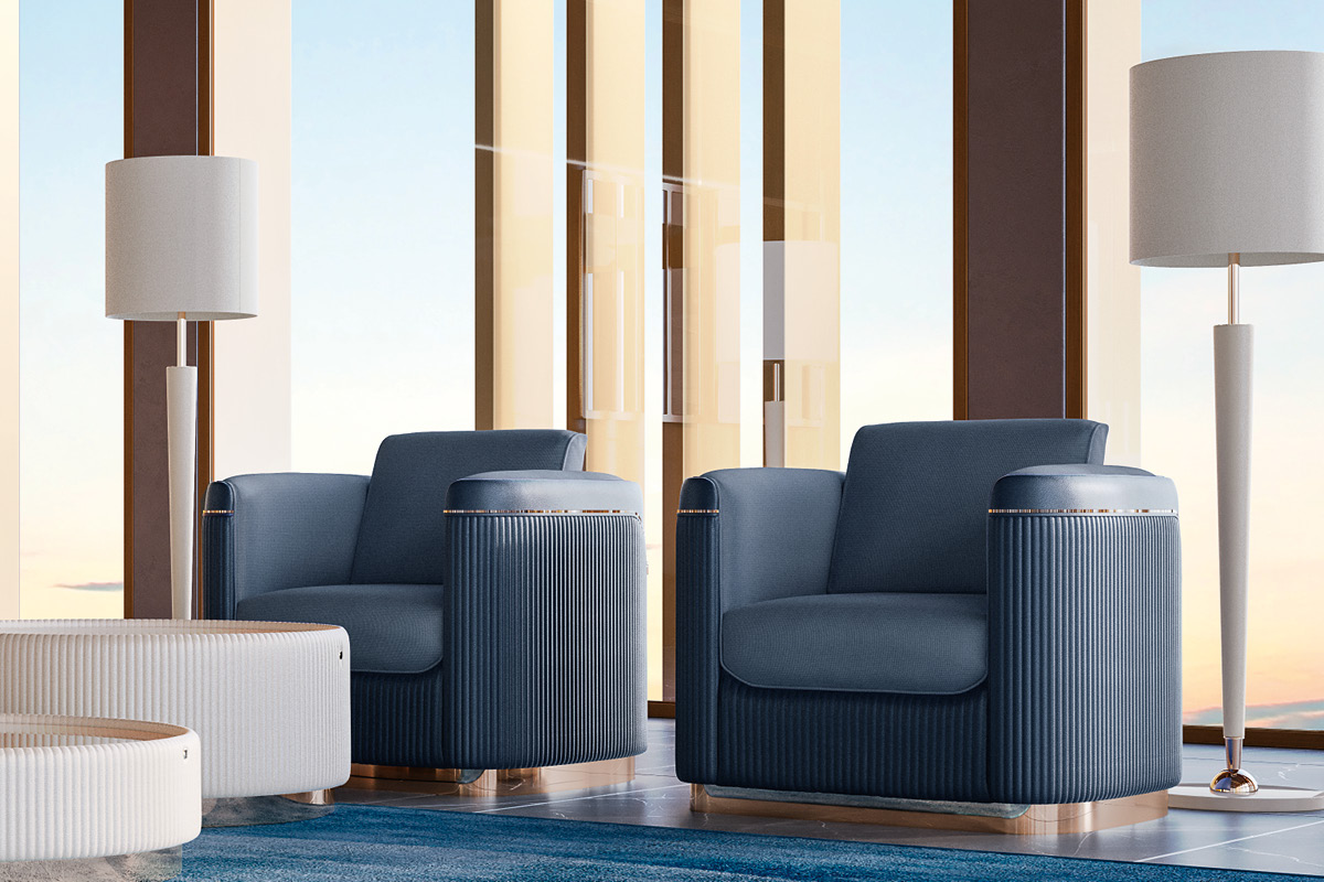 Фабрика Volpi Lampada Teo Base in lacquered wood or solid wood. Carved wood stem upholstered in fabric or leather with details in chrome-plated metal. Fabric top.